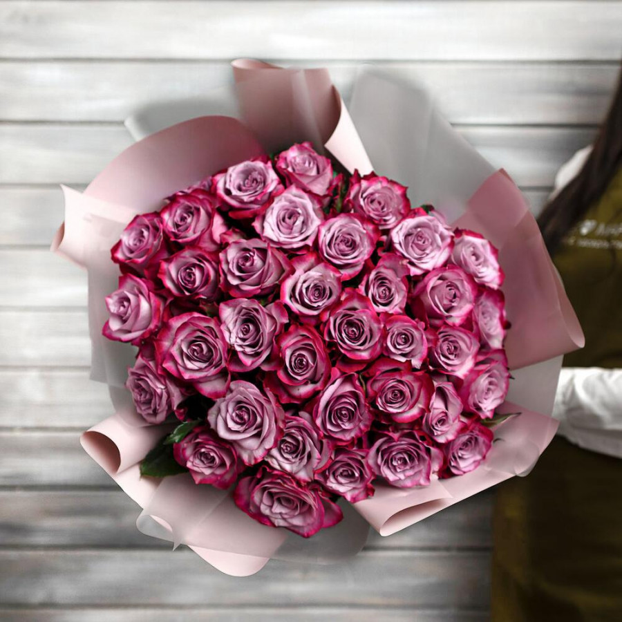 На фото букет из 33 фиолетовых роз. В составе: роза 33 шт, дизайнерская упаковка 1 шт, атласная лента 1 шт, . Все цветы свежие и ароматные, букет красиво оформлен и отлично подходит для подарка. Доступна доставка цветов или самовывоз.
