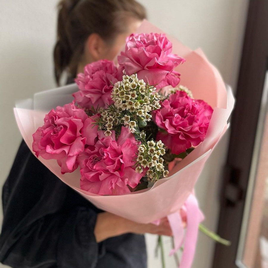 На фото букет из ажурных роз с эвкалиптом. В составе: ажурная роза 5 шт, ваксфлауэр 4 шт, эвкалипт 2 шт, крафт-бумага 1 шт, . Все цветы свежие и ароматные, букет красиво оформлен и отлично подходит для подарка. Доступна доставка цветов или самовывоз.