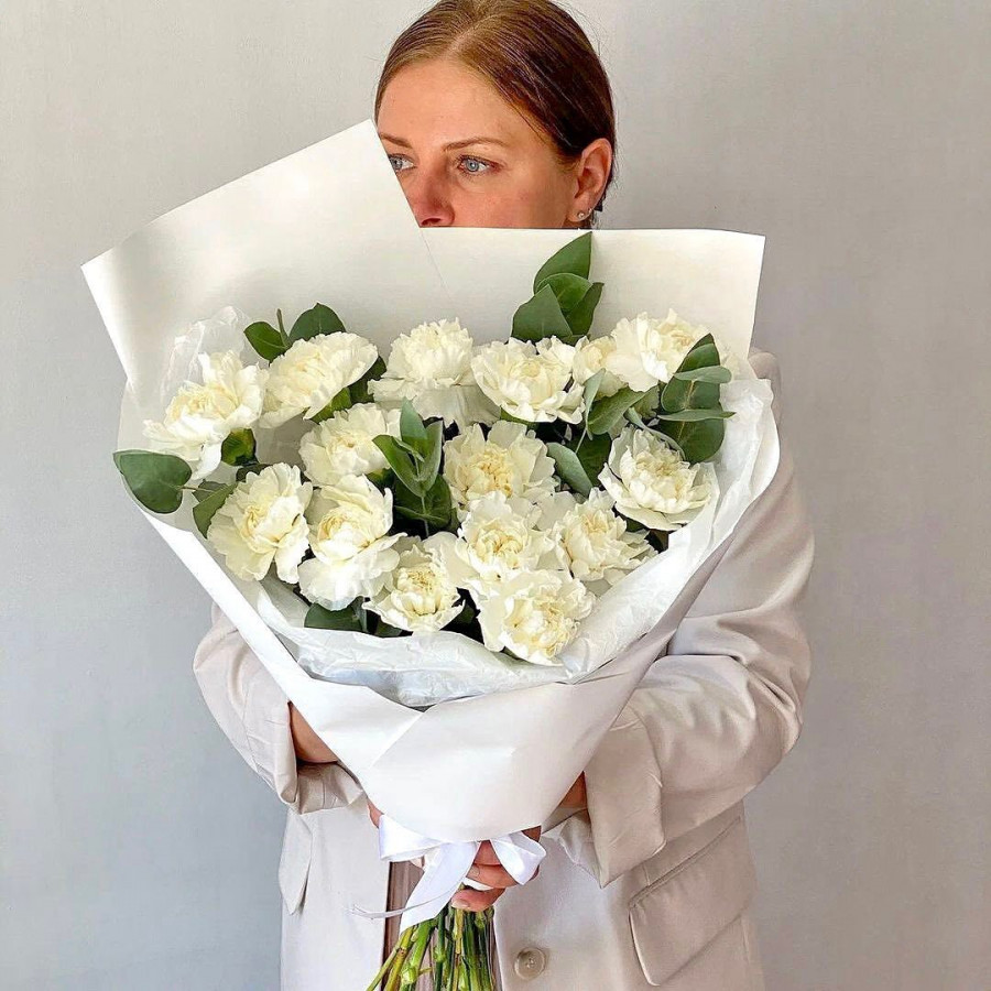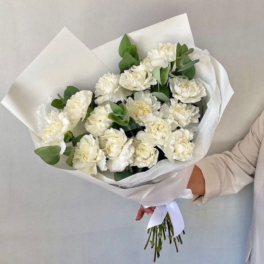 На фото монобукет из белой гвоздики. В составе: гвоздика 13 шт, эвкалипт 4 шт, крафт-бумага 1 шт, атласная лента 1 шт, . Все цветы свежие и ароматные, букет красиво оформлен и отлично подходит для подарка. Доступна доставка цветов или самовывоз.